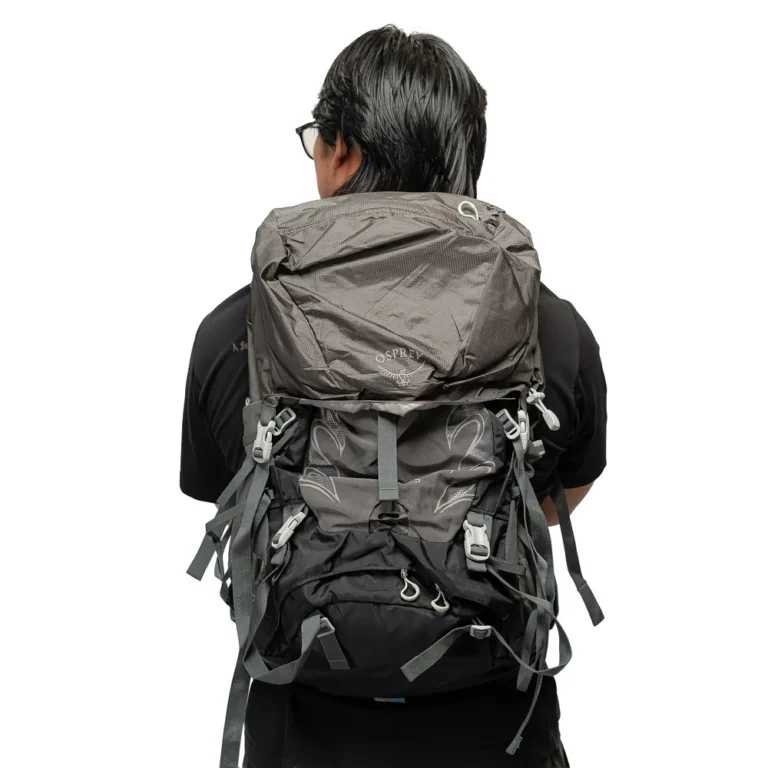 Designed for reliability, this grey Osprey pack features reinforced fabric, a structured frame, and high-efficiency gear organization. The breathable mesh back panel ensures comfort even during steep climbs.