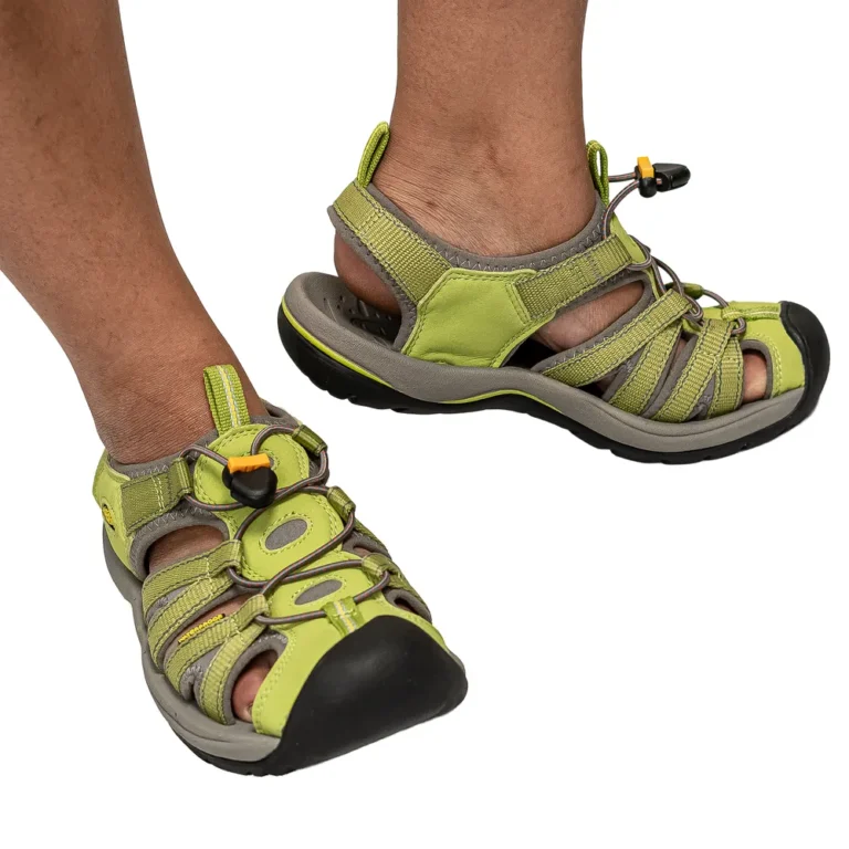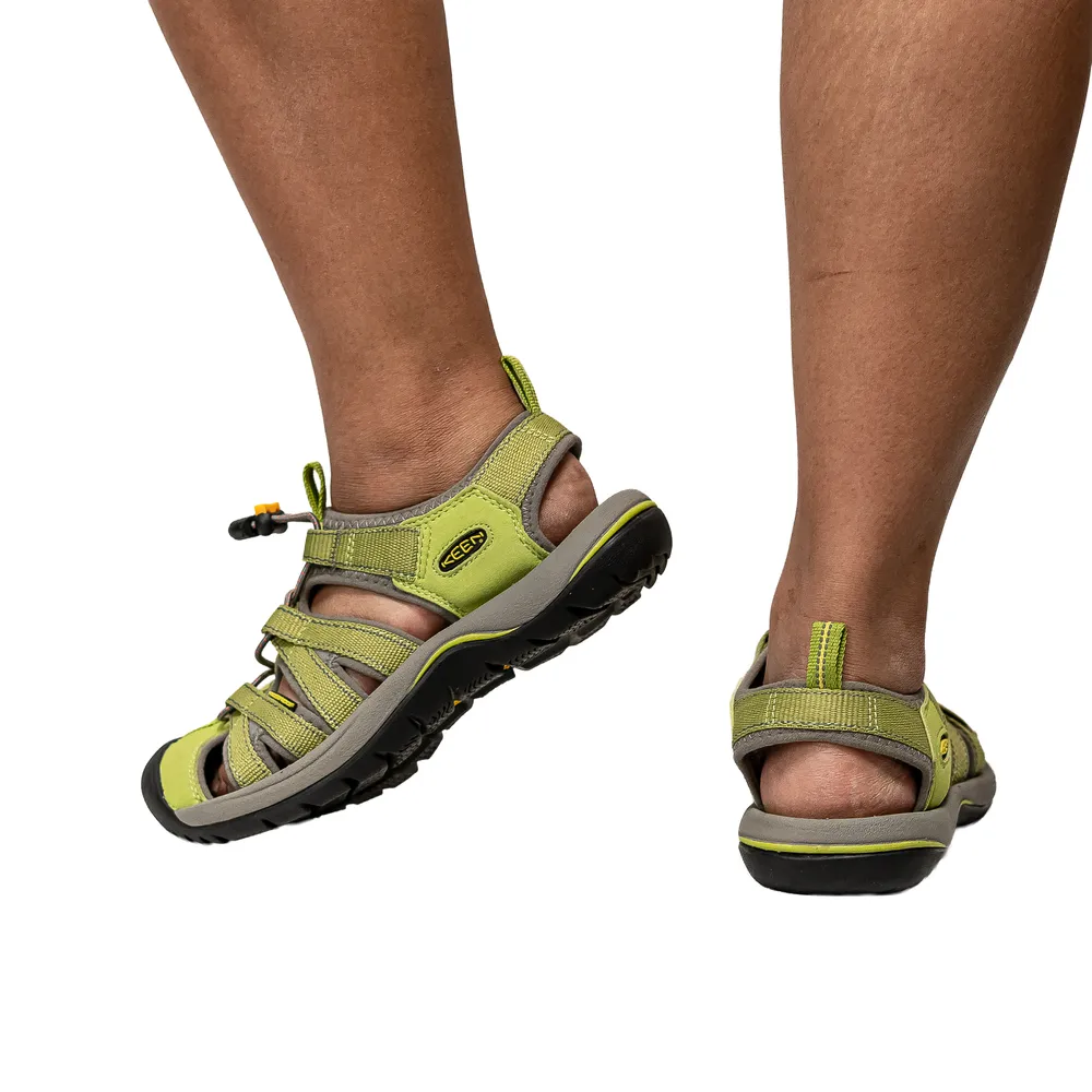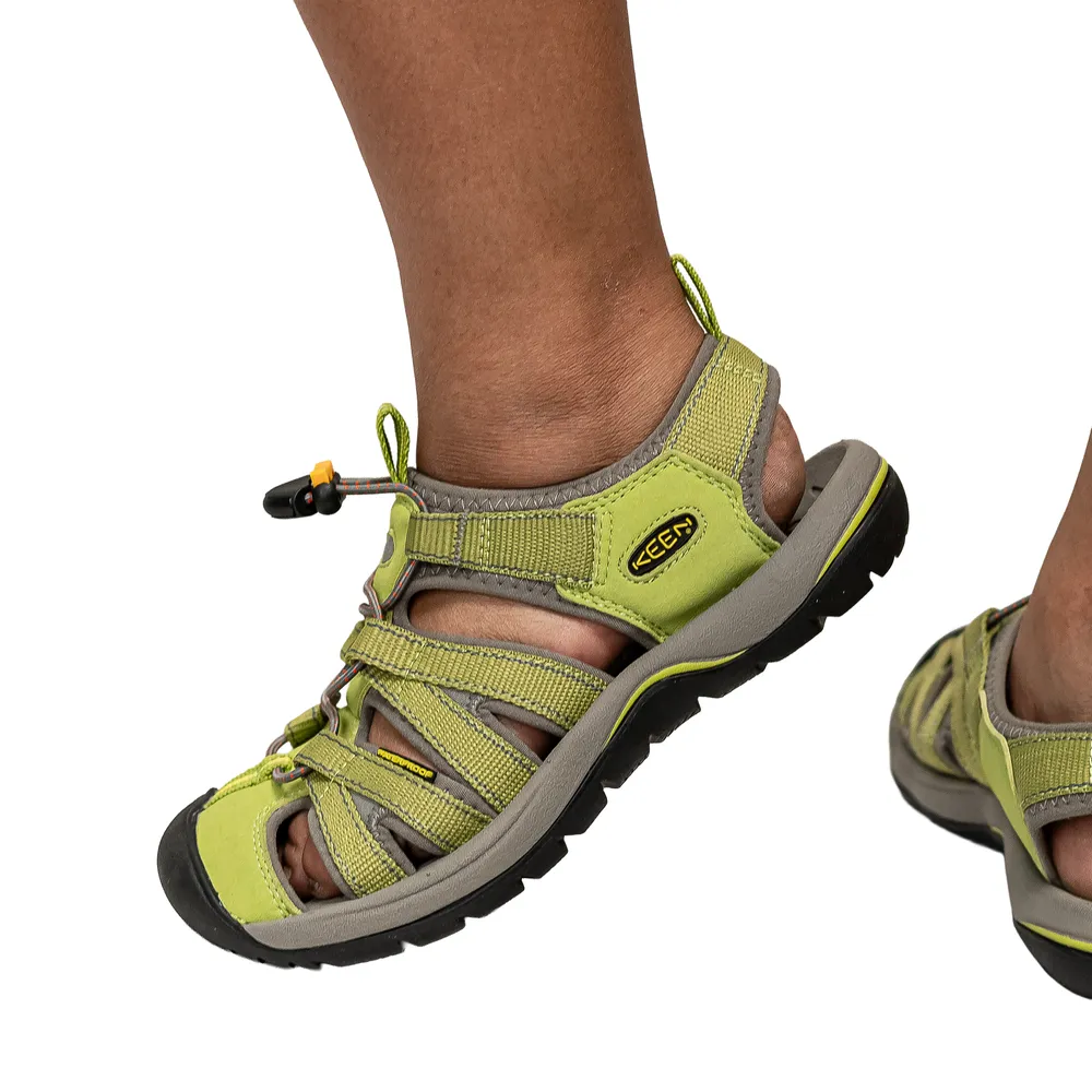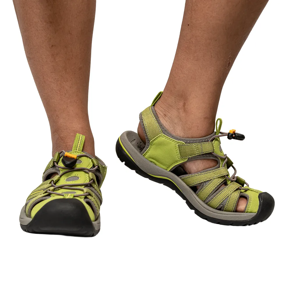 These green Keen walking sandals offer breathable comfort, strong grip, and supportive cushioning for warm-weather hiking. The durable outsole ensures stability on varied surfaces, while the protective toe design enhances safety.
